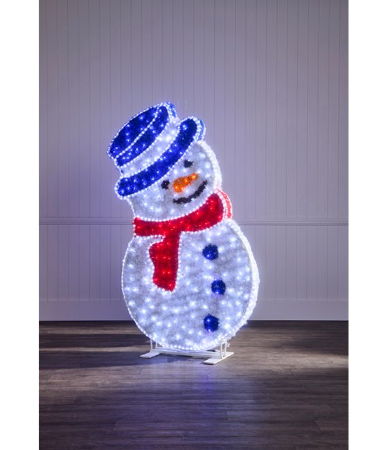 Illuminate your display with our 1.8m Light Up Snowman. This piece will bring a festive ambiance to your display with its captivating bright white LED lights. Beautifully crafted with white, blue, red and orange tinsel carpet, this snowman will bring joy to your display with its festive spirit and welcoming demeanour.