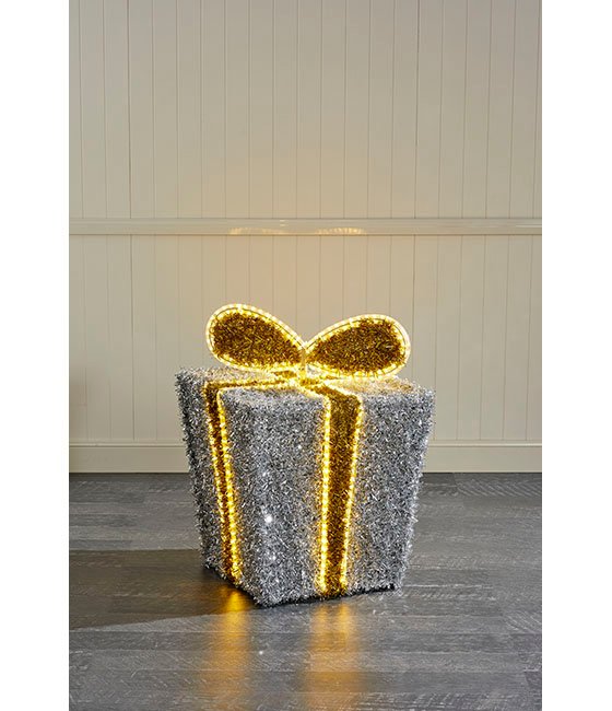 Bring the magic of Christmas to life with our 1m Silver and Gold 3D Light Up Gift Box. This extraordinary decoration features a three-dimensional design, intricately wrapped in shimmering silver and gold tinsel carpet and adorned with vibrant LED lights. The combination of sparkling tinsel and radiant lights creates a stunning visual effect, making it a standout addition to any indoor or outdoor display. Its classic and captivating design make it perfect for enhancing your Christmas tree display.