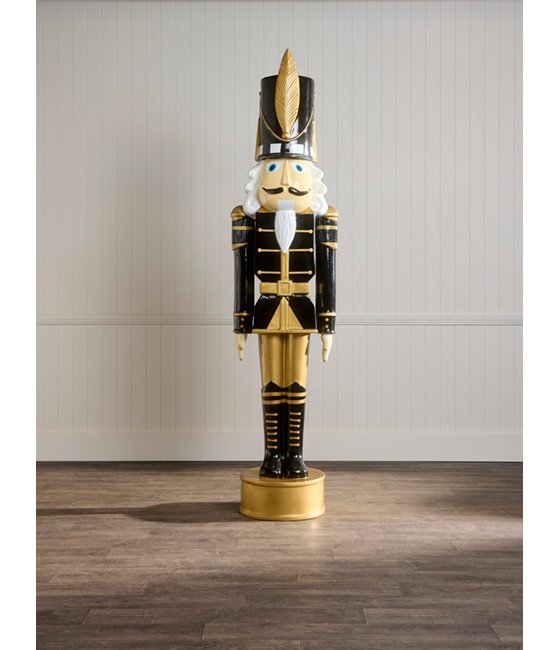 Our 2.4m Black and Gold Christmas Nutcracker is the perfect centrepiece for your display. Crafted from fibreglass, this nutcracker is adorned in a glossy black and finish commanding attention with its impressive size. Whether greeting guests in an entryway or positioned beside your Christmas tree, this nutcracker will enhance your display with its contemporary elegance.