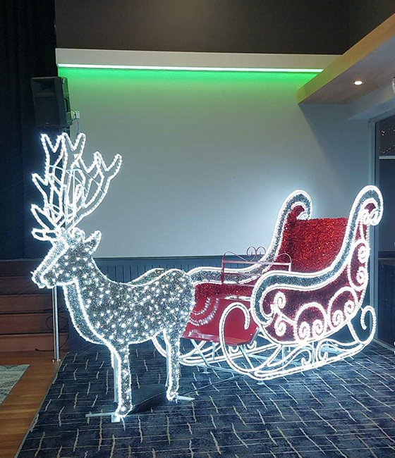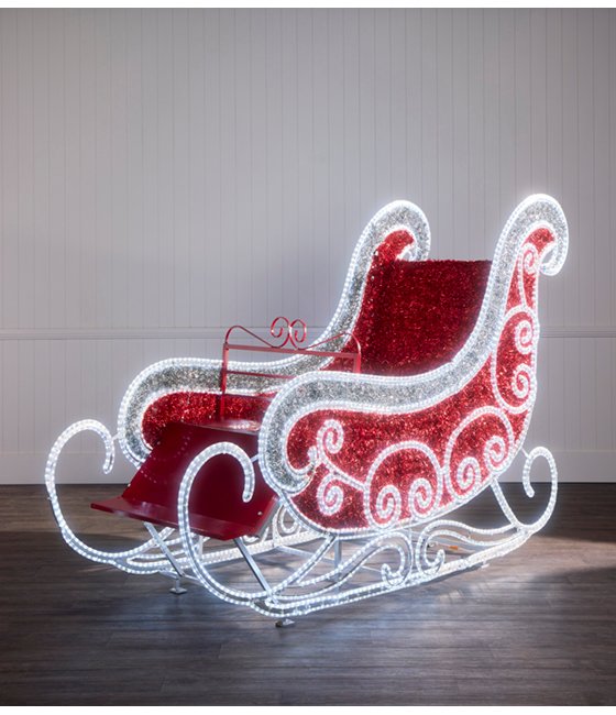 Illuminate your Christmas display with our Red and Silver Light-Up Santa Sleigh. This intricately designed sleigh is adorned with hundreds of Bright White LED lights, to add a festive glow to any indoor or outdoor space. Crafted with exquisite detail, its combination of red and silver tinsel carpet make it a standout piece to bring a touch of elegance to any setting. Perfect for capturing the Christmas spirit, it comfortably holds 2-3 people, with a recommended weight capacity of 90kg, making it an ideal photo opportunity. Pair it with our matching reindeer to complete your display.