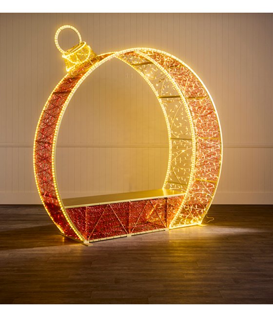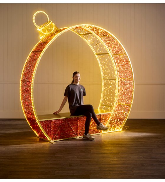 Make a bold festive statement with our 2.5m LED Red and Gold Bauble Seat. Designed for photo opportunities and joyful moments, this oversized Christmas decoration blends functionality with eye-catching illumination. Ideal for commercial displays, shopping centres, and public spaces, it creates a magical seating experience that’s perfect for the Christmas season.