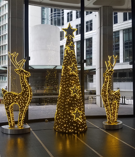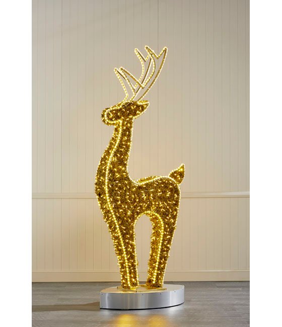 Our 2.6m Gold Royal Reindeer has been meticulously crafted to elevate your display with a luxurious ambiance. This beautiful reindeer is adorned with gold tinsel, intricate warm white rope lights and delicately woven gold string lights, complementing the reindeer’s design to give it a distinctive character and elegance to any display.