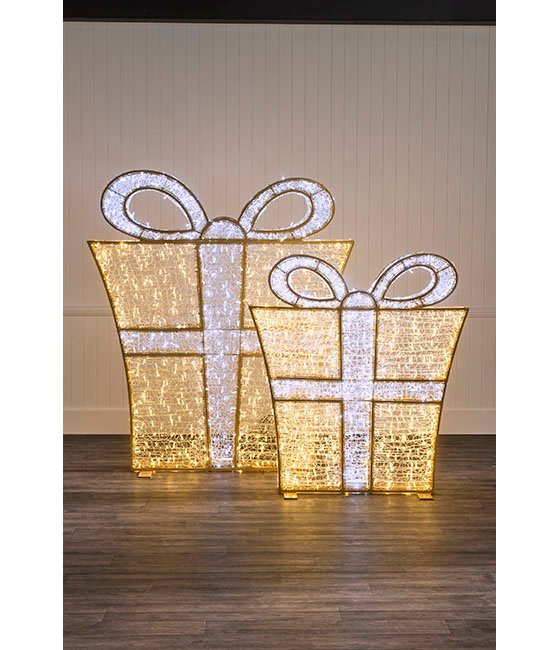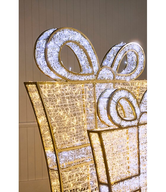 Illuminate your Christmas display with our 2m Gold and Silver Light Up Gift Box. This piece features a beautifully crafted gift box design, wrapped in vibrant, steady and twinkling LED lights, creating a warm and inviting glow. Perfect for both indoor and outdoor settings, it is made from durable materials that can withstand various weather conditions while maintaining its brilliant shine. The intricate detailing and vibrant colours evoke the magic of Christmas, making it a delightful attraction for guests and passersby.
