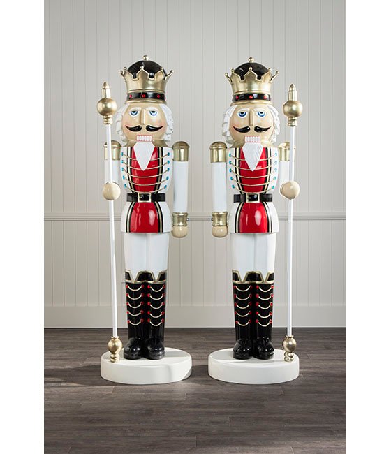 Our 2m White, Gold and Black Nutcracker is the perfect centrepiece for your display. Crafted from a blend of resin and fibreglass, this nutcracker is adorned in a glossy white, gold and black finish complemented by vibrant blue and red gems. Holding a sceptre in its right hand, it commands attention with its impressive size and presence. Whether greeting guests in an entryway or positioned beside your Christmas tree, this nutcracker will enhance your display with its contemporary elegance. Pair it with our matching 2m White, Gold and Black Nutcracker with Sceptre Left to complete your display.
