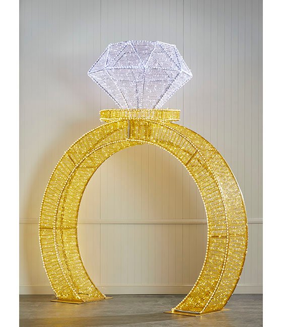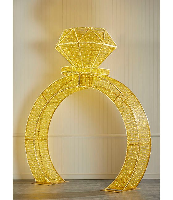 Illuminate your display with our 3.3m Light Up Gold Diamond Ring. This interactive piece invites guests to stand beneath its elegant frame, offering a perfect photo opportunity for wedding photos. Its impressive size and exquisite detail, complemented by warm white LED lights, combine to create a captivating visual experience. Customise this stunning piece with your choice of warm white or bright white LED lights for the ring band and diamond to best suit your display. Please contact us to customise this piece or for further enquiries.