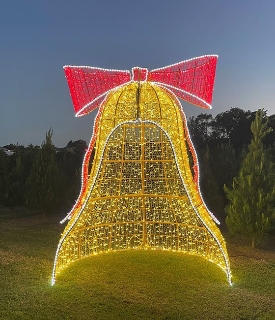 Illuminate your display with our Light Up Walk-in Gold Bell. This interactive piece invites passers-by to step inside the impressive-sized bell, providing the perfect photo opportunity. Featuring warm white LED lights and a beautifully designed bow adorned with red LED lights, this piece creates a memorable experience for all.