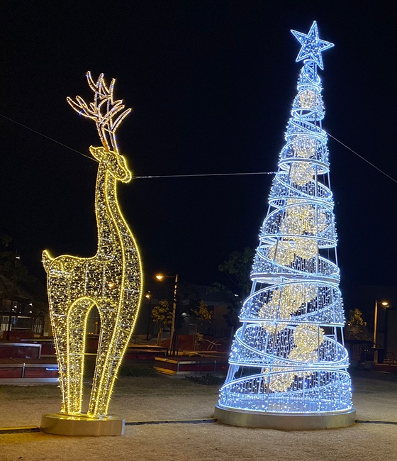 Our 5m Gold Royal Reindeer has been meticulously crafted to elevate your display with a luxurious ambiance. The impressive size ensures it becomes the focal point of any display. This beautiful reindeer is adorned with intricate warm white rope lights and delicately woven gold string lights, complementing the reindeer’s design to give it a distinctive character and elegance to any display.