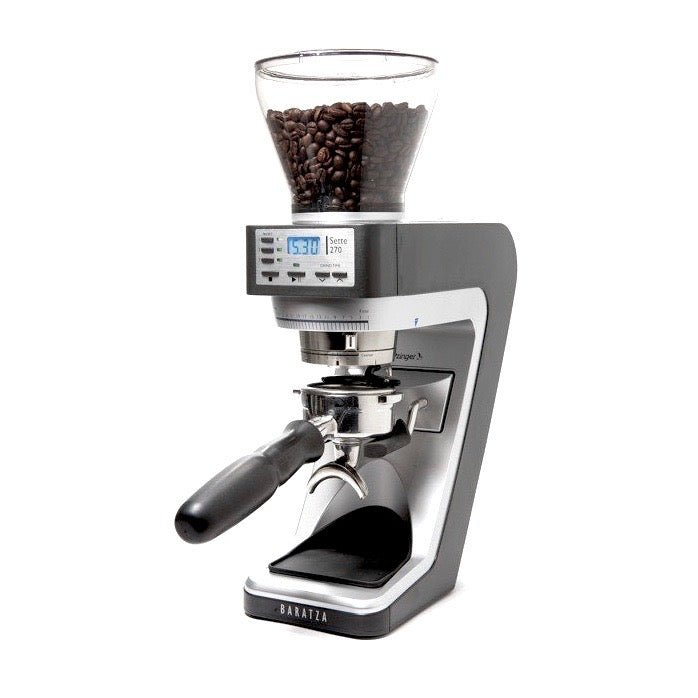 Take the guesswork out of your daily grind with the Baratza 270 Grinder. A unique grind adjustment dial borrows from both stepped and stepless adjusters to get you expertly dialed-in without the time commitment or wasted beans. Supplementary features include three programmable grind doses, adjustable container/portafilter arms and a tool-free disassembly for easy cleaning and maintenance. The Sette’s drop through design offers low retention and high-speed grinding in a small platform.