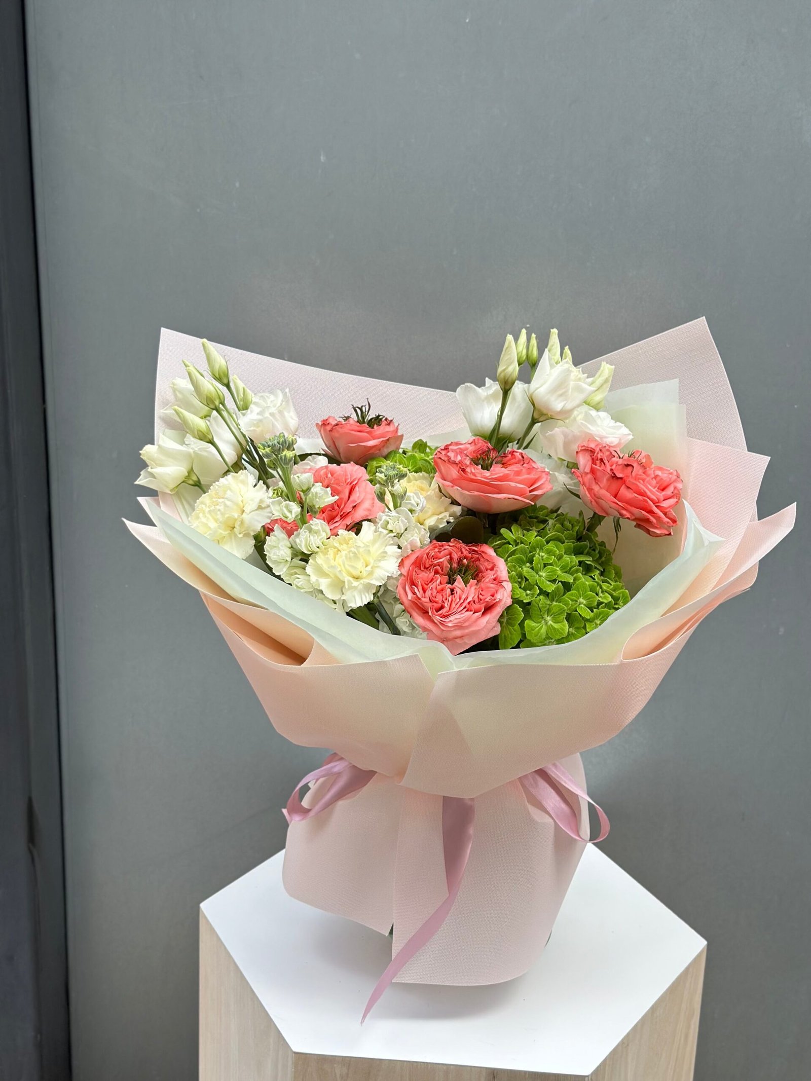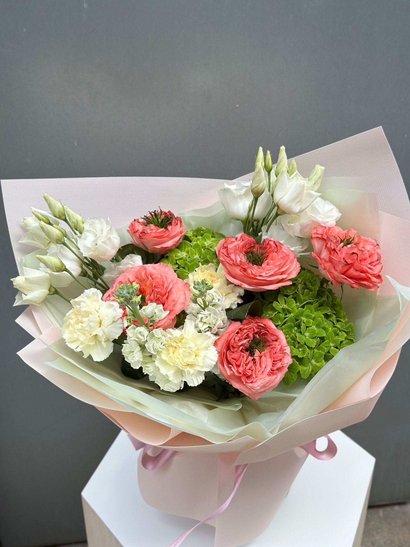 La foto muestra un ejemplo de nuestro ramo tamaño S pero en Florex te ofrecemos algo verdaderamente especial: un ramo único, diseñado exclusivamente para ti.