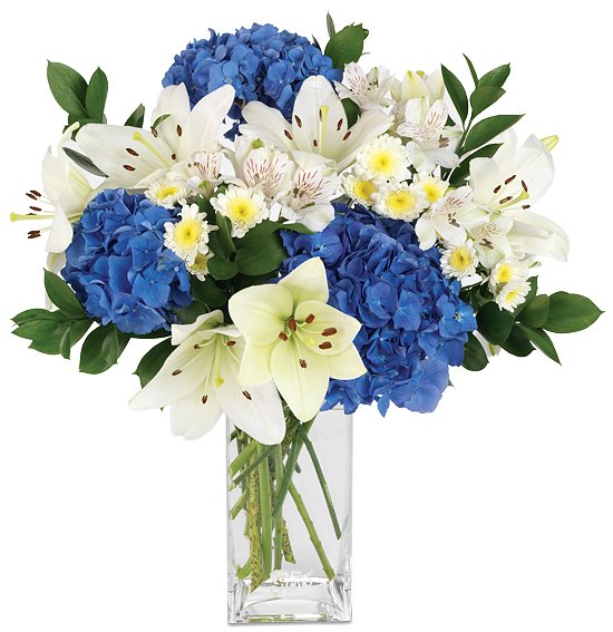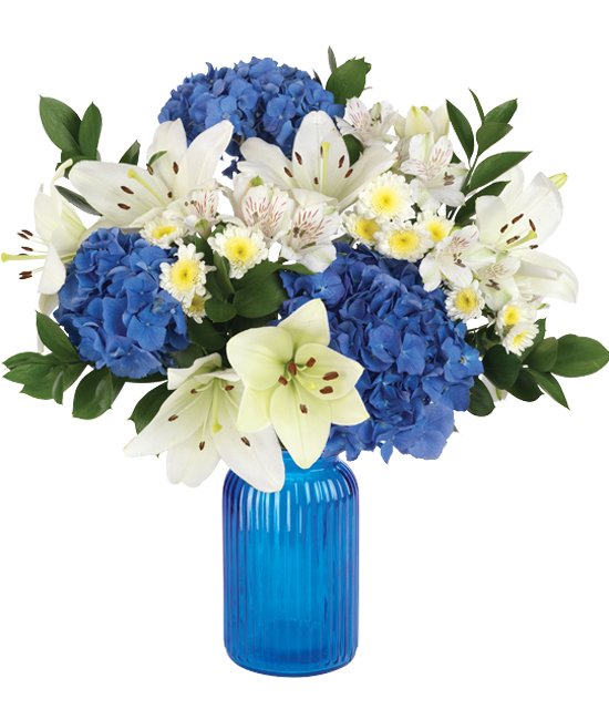 A collection of white alstroemeria, whitelilies, white and yellow chrysanthemums, and green ruscus, along with three of the boldest blue hydrangeas you’ll ever see makes up this gorgeous bouquet. The greatest days begin with the bluest skies, making our beautiful blue and white bouquet a clear winner when it comes to brightening any day or occasion. How many occasions does this make a gorgeous gift for? The sky’s the limit!