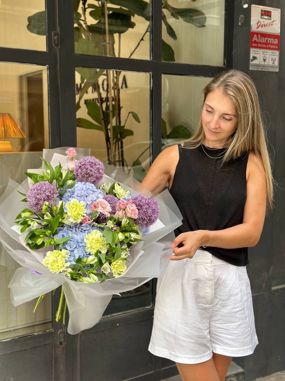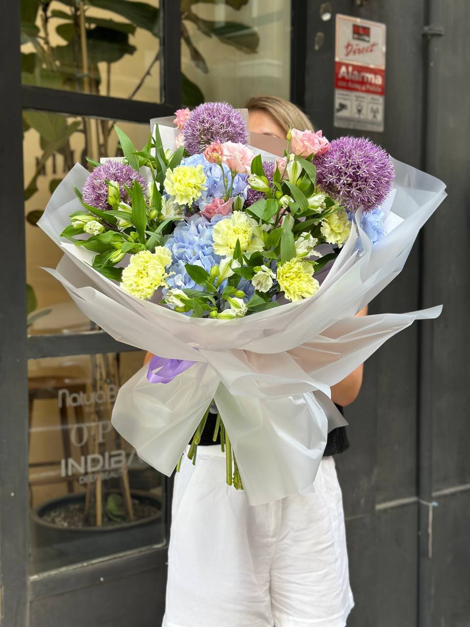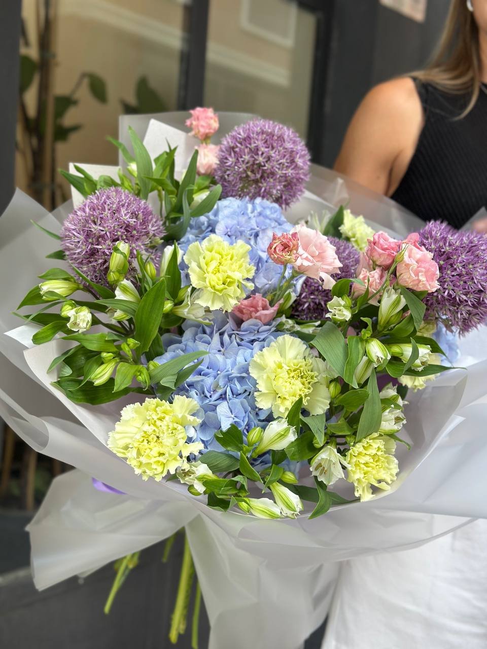 Con alliums, hortensias azules, lisianthus, alstroemerias y claveles verdes, esta composición transmite energía y estilo.