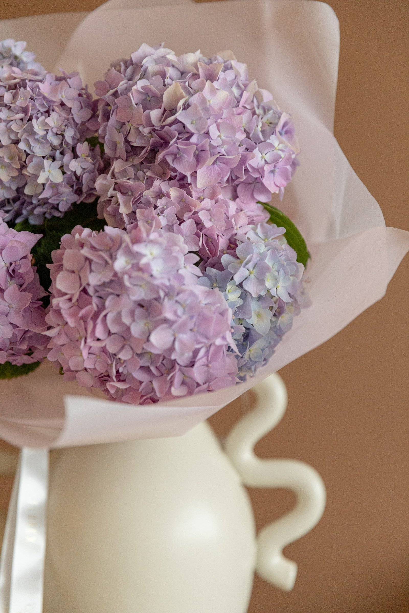 Composition This bouquet is elegantly simple, solely composed of hydrangeas. These blooms are known for their lush, rounded clusters of flowers, which add a voluminous and soft appearance, resembling a cloud.