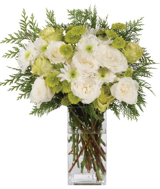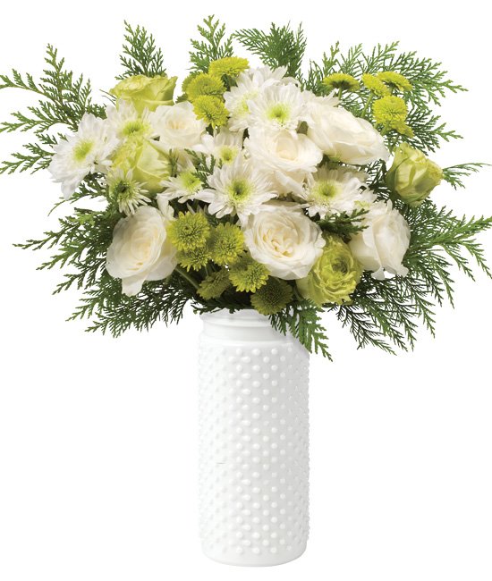Bright and simply beautiful, its no wonder fresh white flowers are such a favorite during the winter months. A picturesque bouquet to brighten any winter day, we’ve gathered pure white Blizzard roses and white/green cushion mums along with Green roses and Yoko Ono button mums and embraced them all with sprays of fresh cedar. Our tall white hobnail vase completes the elegant offering.