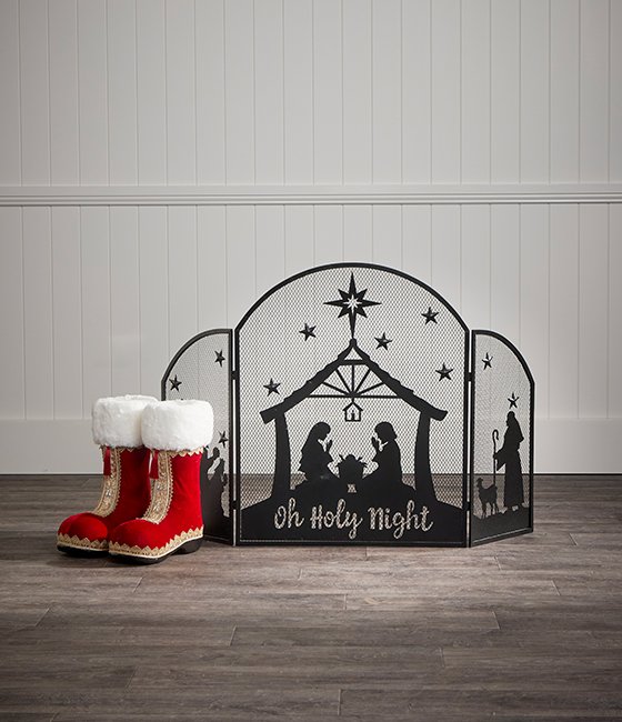 This Christmas Fireplace Screen features a three-panel design showcasing detailed silhouettes of the Holy Family, Three Wise Men, and Shephard Boy under a starry Bethlehem sky. Reading “Oh Holy Night”, this piece creates a peaceful and inviting for your Christmas setting. Crafted from durable iron with a black powder-coated frame, this piece is lightweight yet sturdy, adding a beautiful finishing touch to your fireplace or mantel.