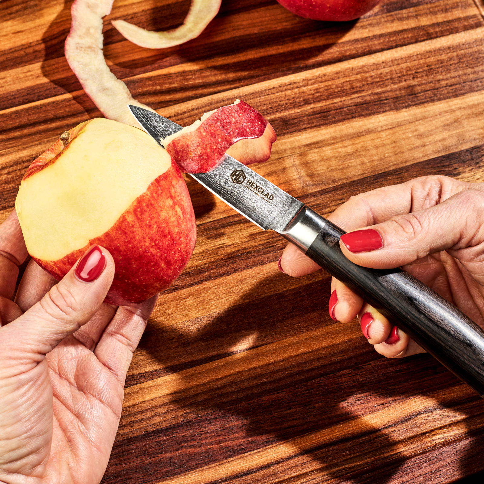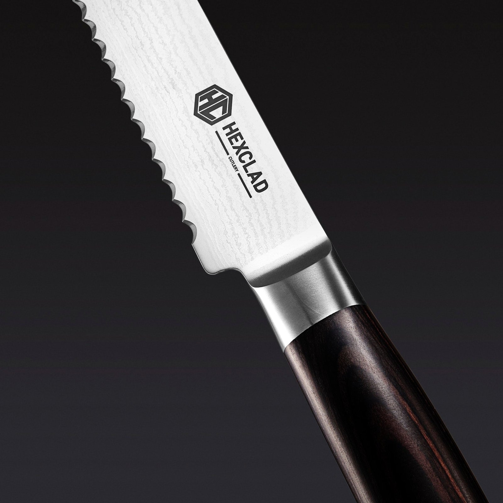 Our new espresso-colored Damascus steel knives are as striking in a modern kitchen as a rustic one, and we cut no corners in making them. Think: 67 layers of Damascus steel. Twelve degree blade sharpness. Rockwell ratings of 60 or higher. The knives themselves boast ergonomically designed pakkawood handles that have been treated with anti-shrinking technology, for added durability. This essential knife set–which includes a honing steel–will both speed up your prep work and level up your cooking prowess.