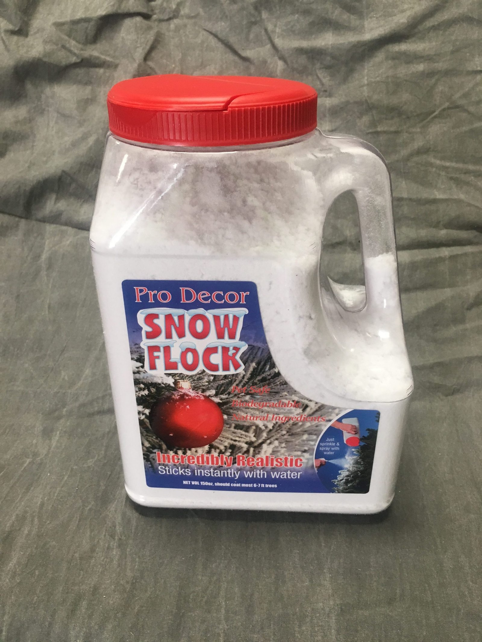 Simply shake and spray with fine mist of water and the snow flocking will stick to any surface.