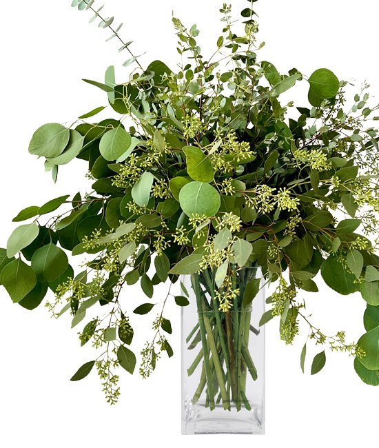 Fresh, beautiful eucalyptus has quickly become a popular greenery. Their rich color and texture will add appeal and charm to that unique gift. This combination of different types, artfully placed in our shiny gold vase will ‘WOW’ your recipient or simply dress your table for the Holidays.