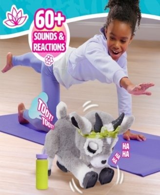 Namaste all the way to Zen levels of fun with the fur Real Daisy the Yoga Goat interactive plush toy. This lifelike, interactive toy goat features over 60 sound and motion combinations. To begin play, flip the switch on her belly and pet Daisy’s back. She giggles and bleats cute yoga phrases, like “Ohm…” Keep petting her back to watch Daisy perform downward dog and bird dog poses. Sometimes she’ll even toot during a pose – just like real yogis After playtime, give her a drink from the play water bottle to hear fun gurgling sounds. Then press and hold Daisy’s back for 3 seconds for Meditation mode. Hear soothing music and deep, cleansing breaths. Featuring super-soft gray plush fur, this 11.4-inch goat plushie wears an adorable green head wrap. Daisy is sure to be a favorite in any collection of stuffed animals and fur Real pets sold separately. A great birthday and everyday surprise for animal lovers and kids ages 4 years and up.