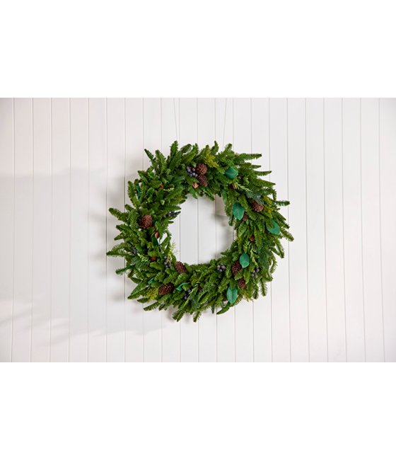 The “Green Wreath with Pine Cones and Blueberries” is a beautifully crafted 100cm (approximately 3.2ft) wreath. Its rich green foliage is adorned with classic pine cones and delicate blueberries, adding a festive and natural charm to your seasonal display. Perfect for those who appreciate a touch of woodland elegance, this wreath is easy to display: whether hung on a door (consider using one of our wreath hangers) or laid flat on a table as a traditional foliage centrepiece.