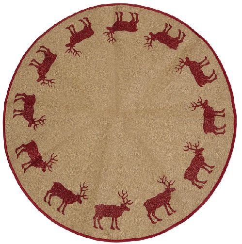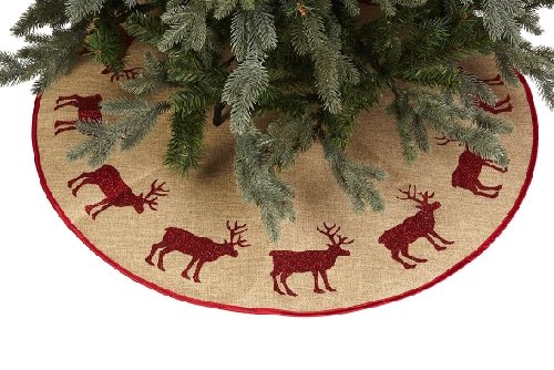 This design is made from a hessian fabric with red glitter reindeer and finished with a red edging and has been our most popular design over the last few years for both fresh and artificial Christmas trees.