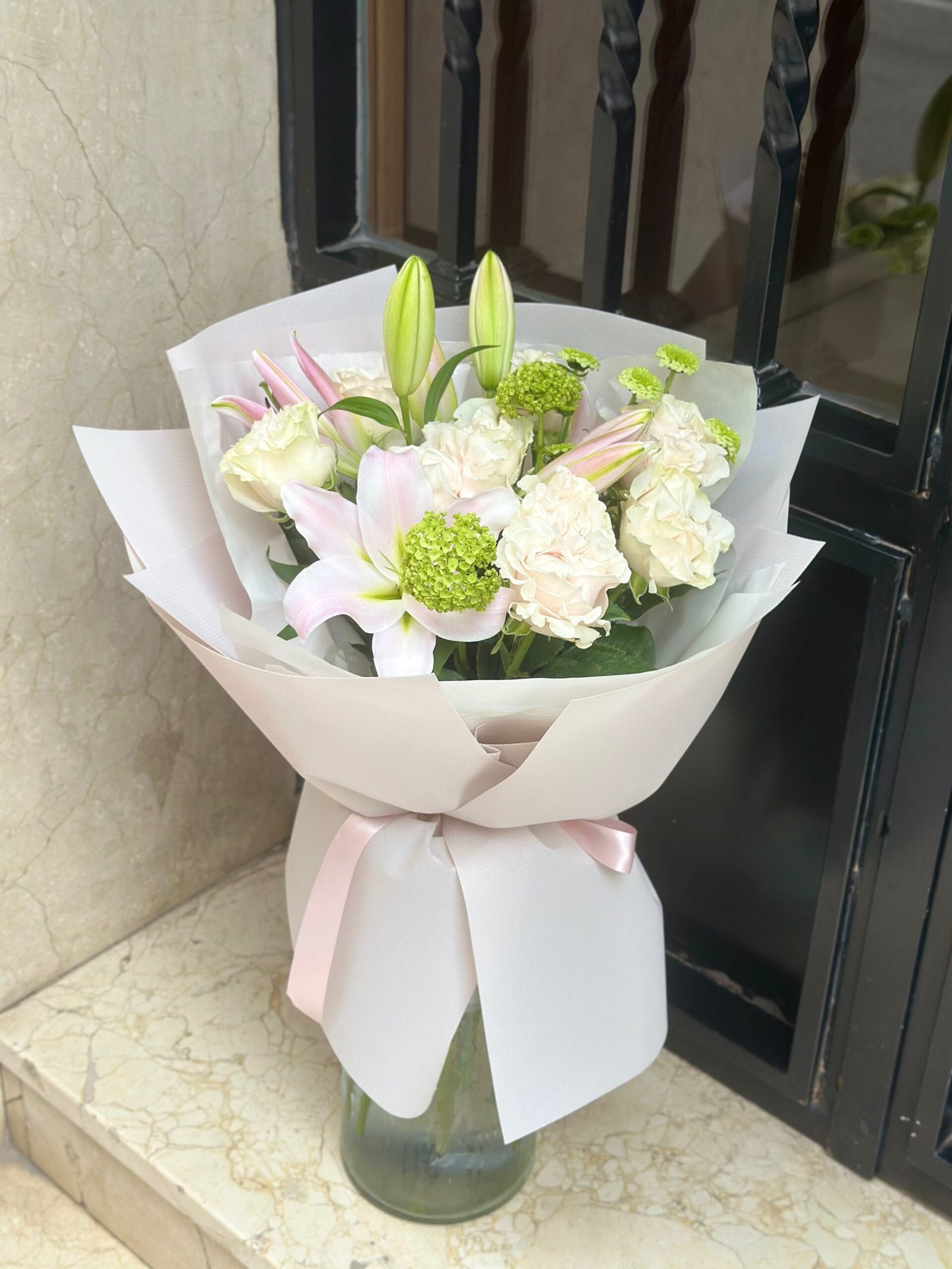 La foto muestra un ejemplo de nuestro ramo tamaño S pero en Florex te ofrecemos algo verdaderamente especial: un ramo único, diseñado exclusivamente para ti.