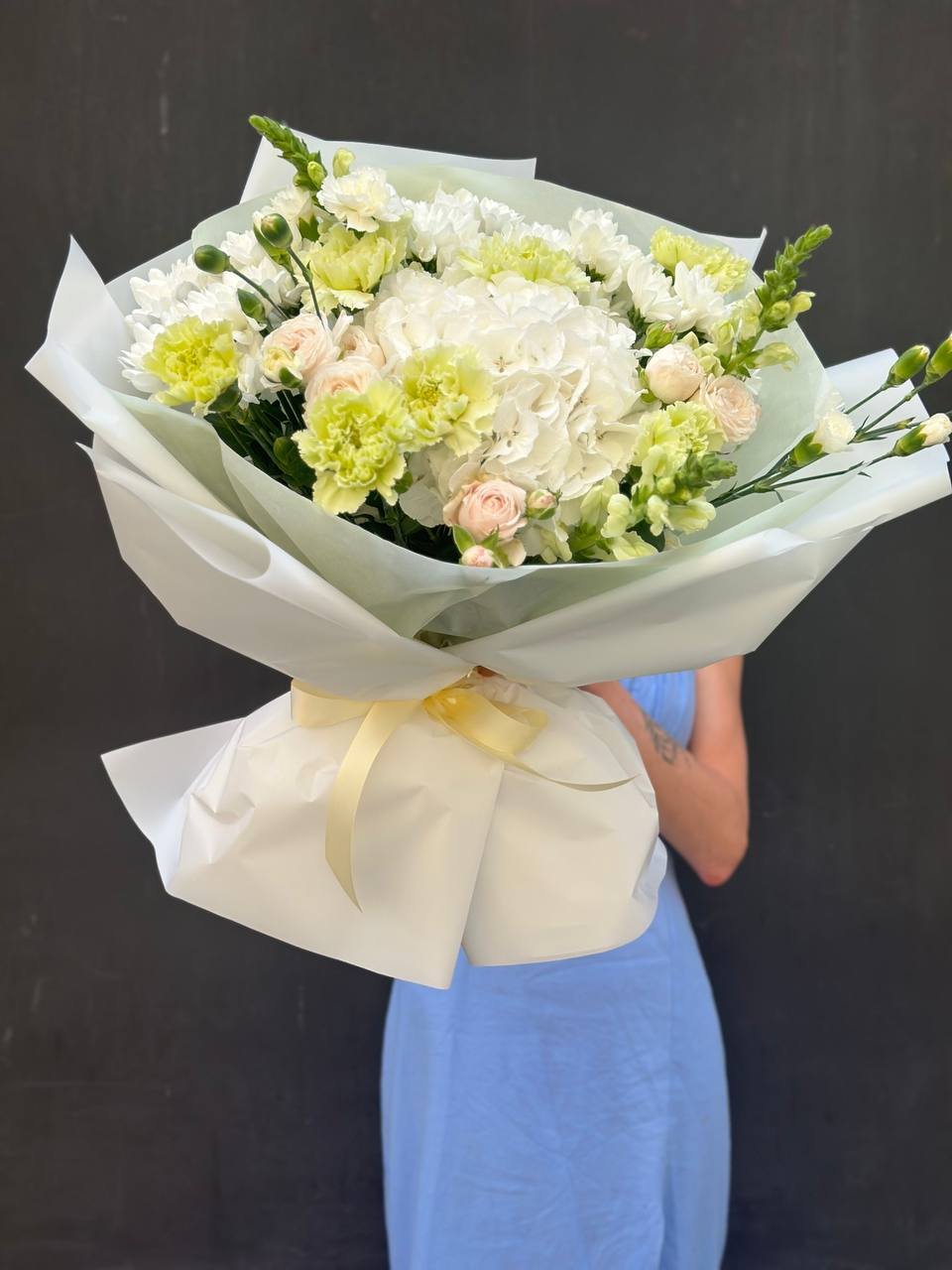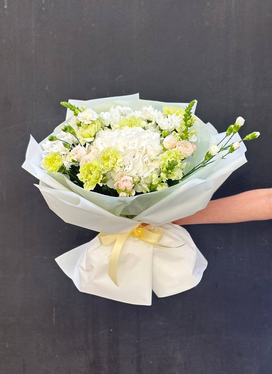 Hecho con hortensias, rosas ramificadas, claveles y flores de temporada, transmite la energía tranquila de una nueva mañana.