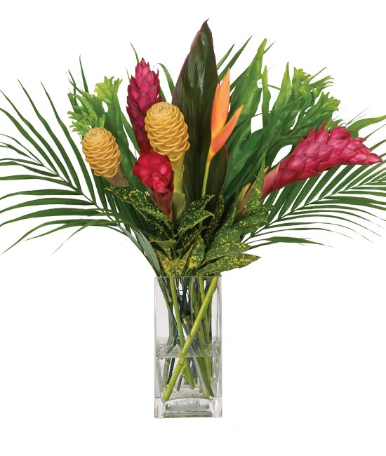 From warm and humid equatorial climes come some of the most striking specimens found in the flower world – a collection of them gathered here in our colorful celebration of the rainforest. Embraced by gorgeous green palms, a bouquet of vibrant colors creating a sultry display in our signature glass vase.
