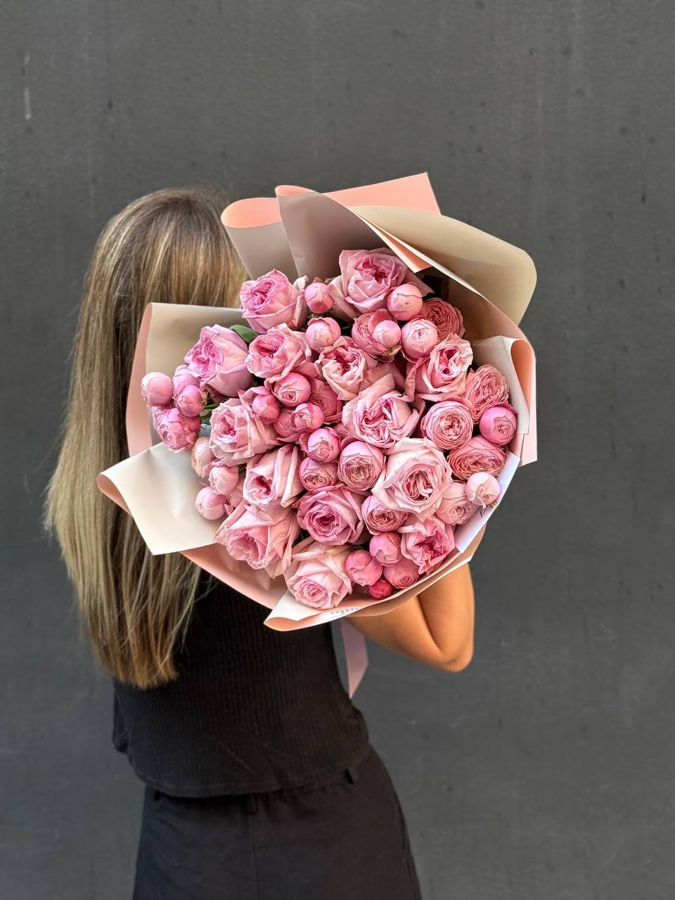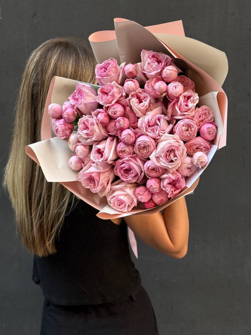 Un ramo lujoso con rosas aromáticas Pink O’Hara y rosas ramificadas de forma peonía en tonos suaves de rosa.