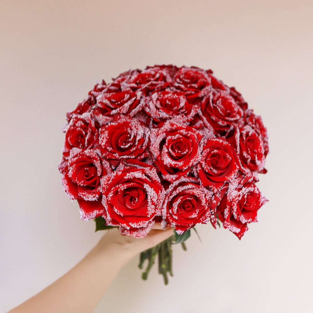 Elegant holiday bouquet with snowy roses will amaze everyone present with its sophistication. The incredible combination of frost on the flowers and their red color is mesmerizing. The arrangement is a masterpiece of the true spirit of the Christmas holidays. Snow on the flowers allows you to immerse yourself in a fairy tale and enjoy it. The festive decorations are essential to creating the perfect holiday bouquet. Whether you choose or create this bouquet, it shows your refined taste. The composition will decorate and become a decor for any event, especially at the Christmas table. You can use the arrangement as a centerpiece for your table. You can also choose a gift for a person dear to you. The combination of snowy decor and red color will create a magical effect. An elegant holiday bouquet with snowy roses will help you express your feelings for a person.