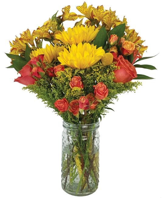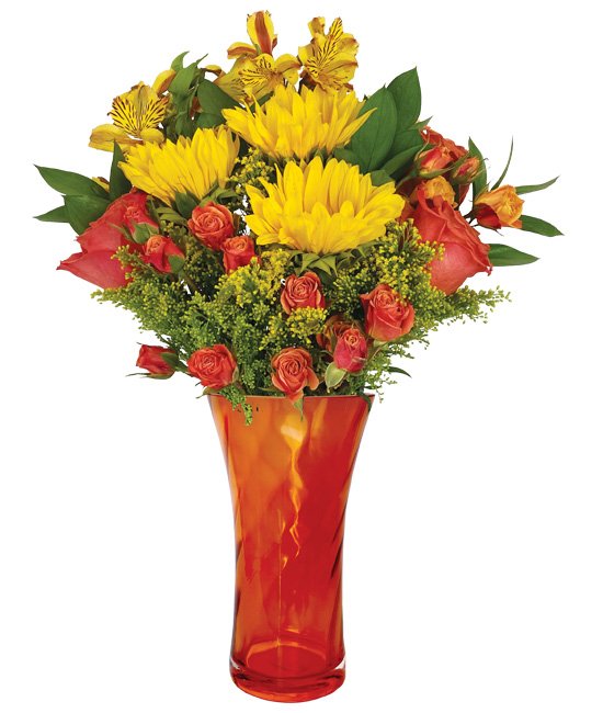 This bouquet sums up the experience of sunset beauty with its orange and yellows.  It’s particularly special when paired with our classic orange glass vase, representative of our love for captivating sunsets.