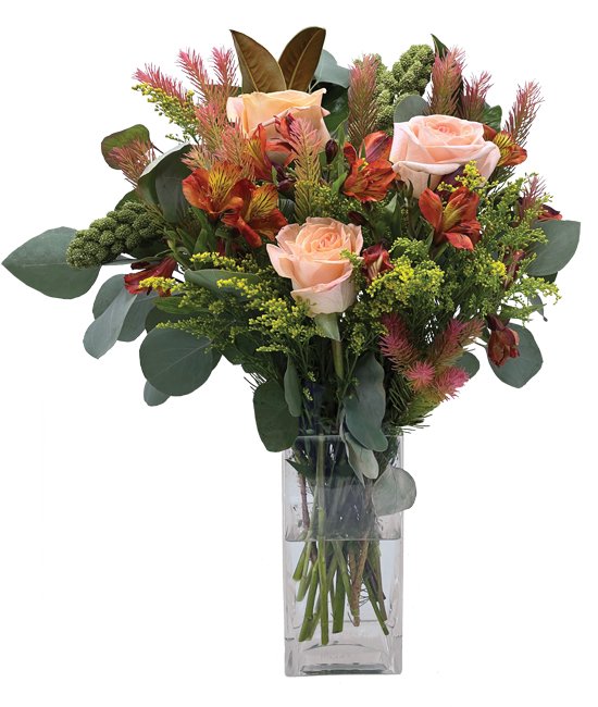 Simply beautiful and elegant. Roses and seasonal pines of various colors are tucked into our diamond-cut vase.
