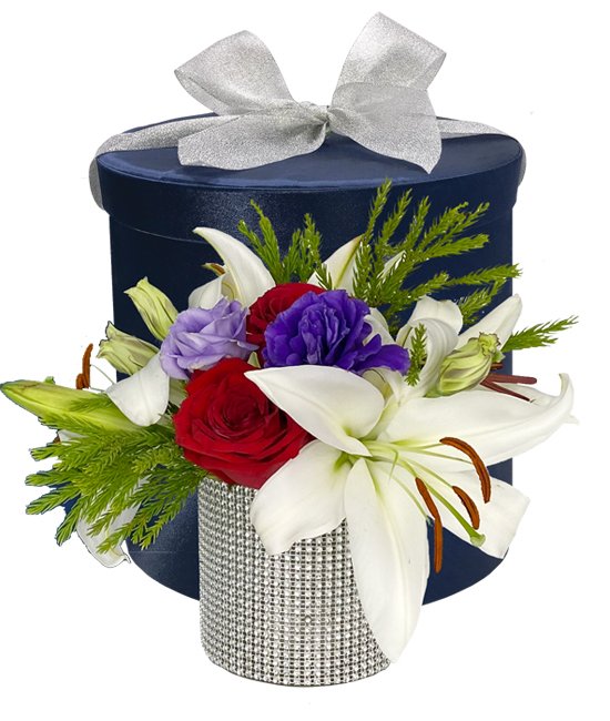 Uncover this beautiful Calyx Hatbox to expose ‘perfection’. A combination of roses, lilies, lisianthus and pines all tucked into a sparkling/glittering cylinder vase.