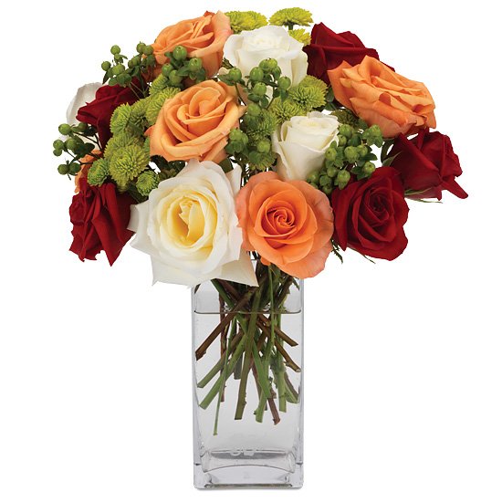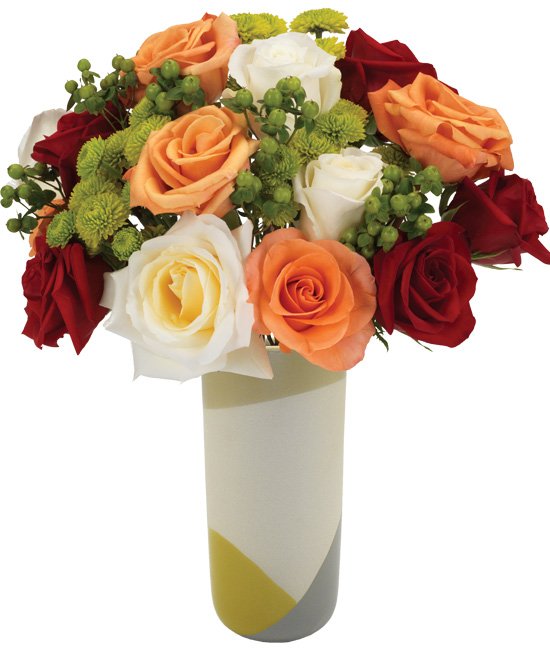 White, Red Freedom, and Orange Unique roses open in flawless form, their large blooms magnified by the subtler nature of green button mums, hypericum berries, and Israeli ruscus. Our abstract vase makes an ideal showcase for the stems.  A refreshing look indeed.