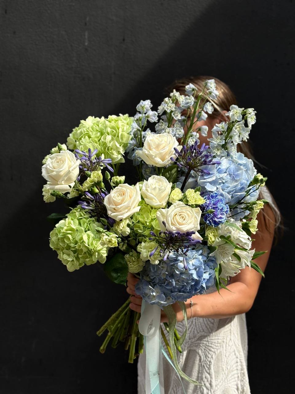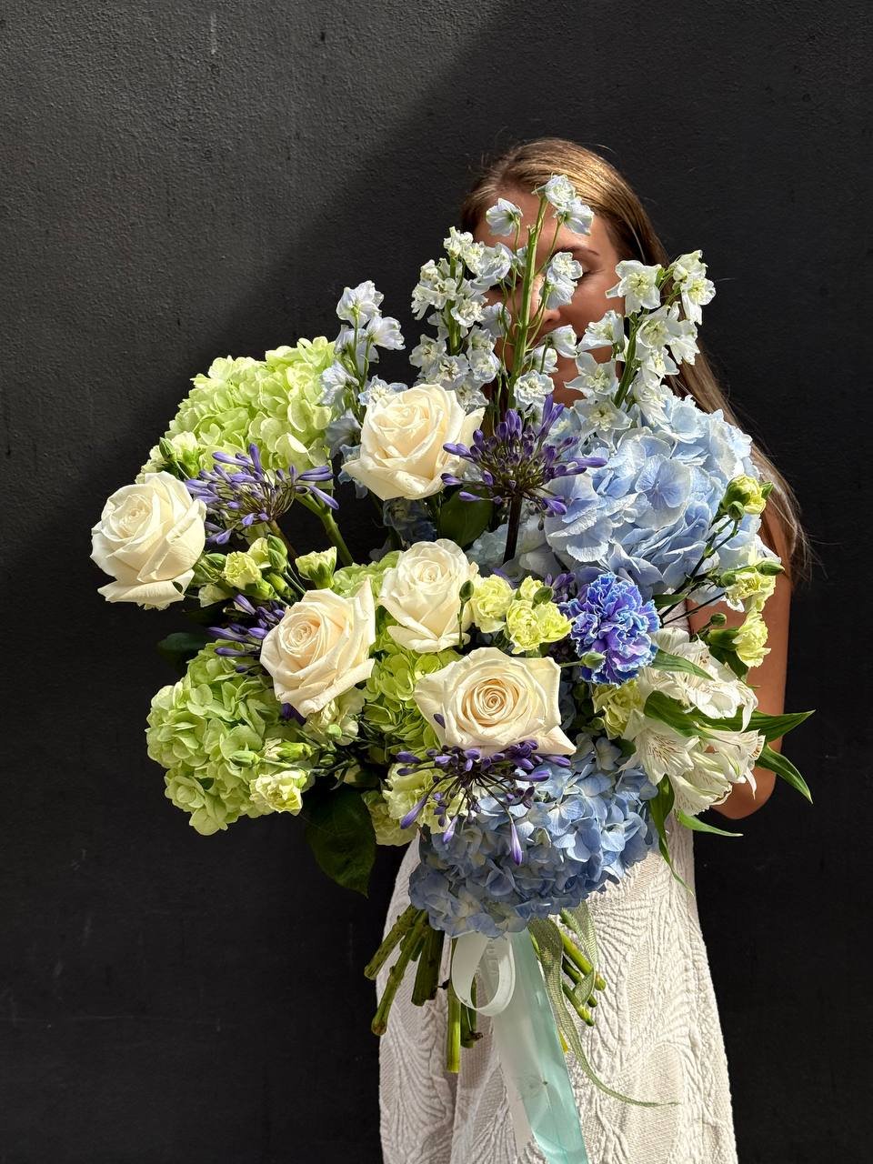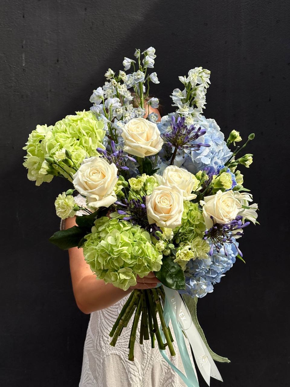 Un ramo fresco y elegante en tonos azul cielo, verde lima y blanco crema.