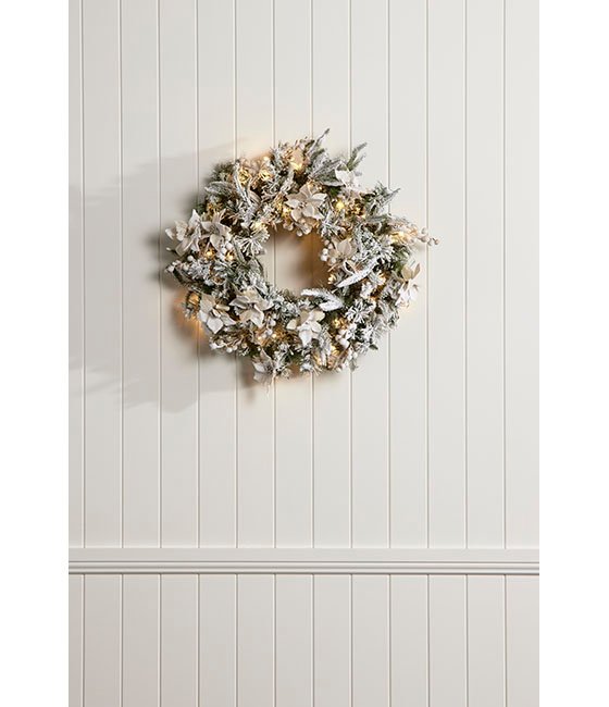 The “Snow Pre-Lit Wreath Flowers” is a snow flocked, pre-decorated wreath, which will bring a touch of elegance to any room with its soft, cream poinsettias, white berries and frosted mixed foliage. Made from a mixture of PE and PVC branches, the frosted colonial is combined with 50 Warm White LED lights to create a truly glamourous look.  It can be hung on a door (consider using one of our wreath hangers) or laid flat on a table as a traditional foliage centrepiece.