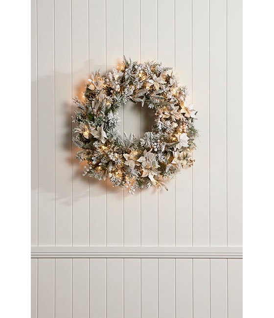 The “Snow Pre-Lit Wreath Flowers” is a snow flocked, pre-decorated wreath, which will bring a touch of elegance to any room with its soft, cream poinsettias, white berries and frosted mixed foliage. Made from a mixture of PE and PVC branches, the frosted colonial is combined with 70 Warm White LED lights to create a truly glamourous look. It can be hung on a door (consider using one of our wreath hangers) or laid flat on a table as a traditional foliage centrepiece.