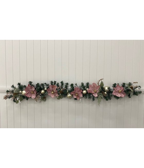 This Snow flocked Pink and Gold Bauble Berry Garland will bring a touch of elegance to any room with its soft pink Magnolias, gold accents and frosted mixed foliage. Pair it with the matching wreath to create a truly magical look for your display.