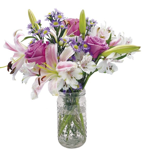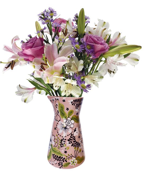 Roses, lilies, and daisies are beyond stunning. This bouquet is reminiscent of New England cottages and outdoor gardens of lovely Cape Cod. The pitcher is one of the most beautiful and unique pieces Calyx has ever offered, designed with a seahorse handle. Long after the flowers have bloomed, this decorative pitcher will be loved and admired through the years.