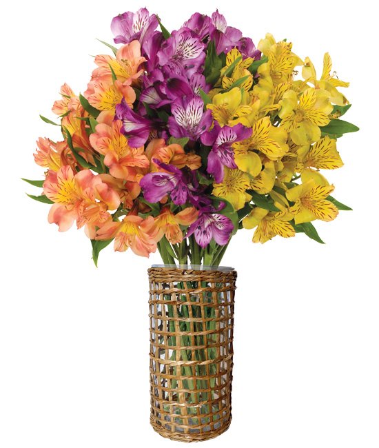 There is a certain time of year when the countryside appears blanketed in the most brilliant and bold colored blooms that Mother Nature has to offer. Summer in full beauty was indeed the inspiration for this colorful creation. Multi-blossomed Alstroemeria lilies arrange freely in our wicker wrapped glass vase.