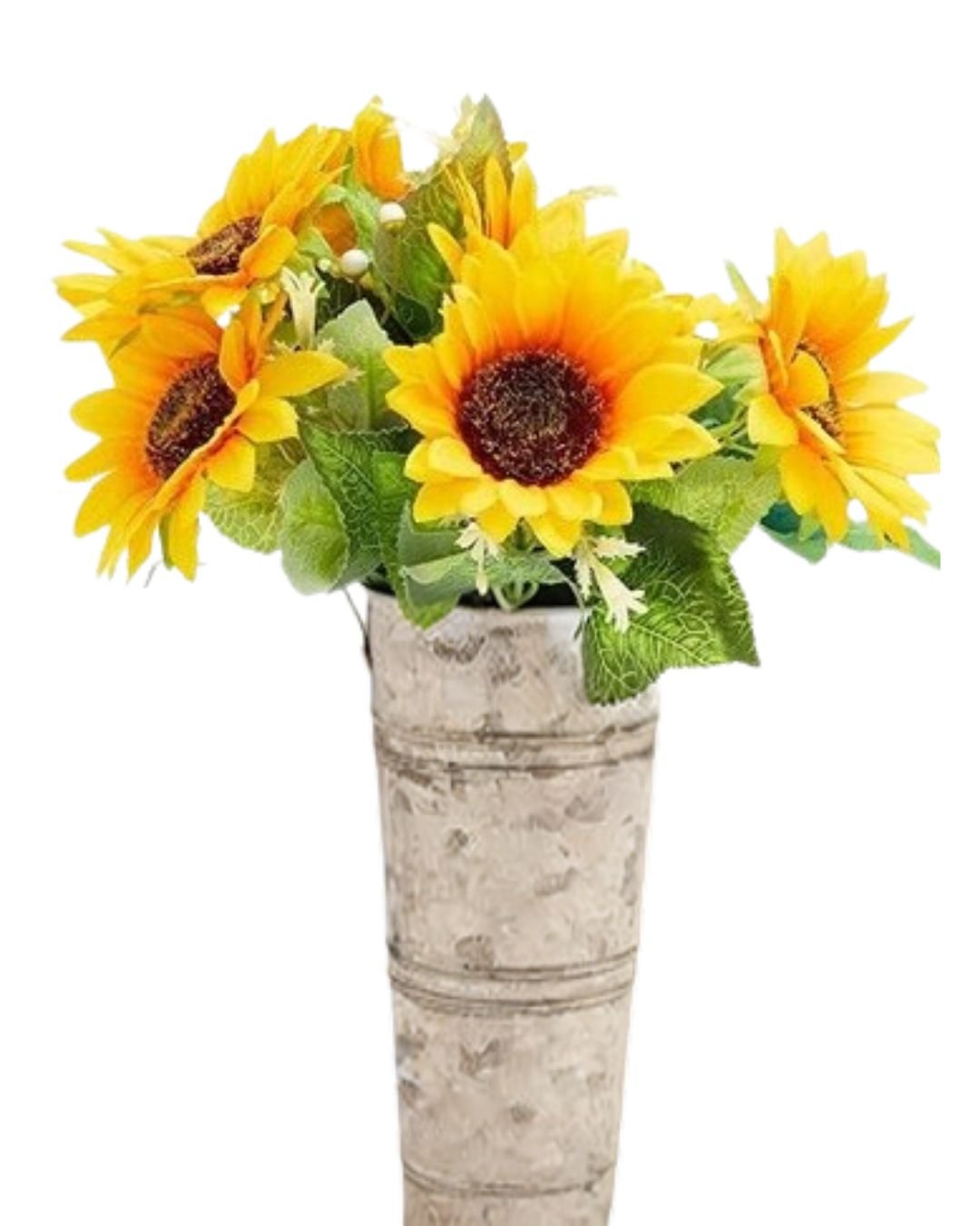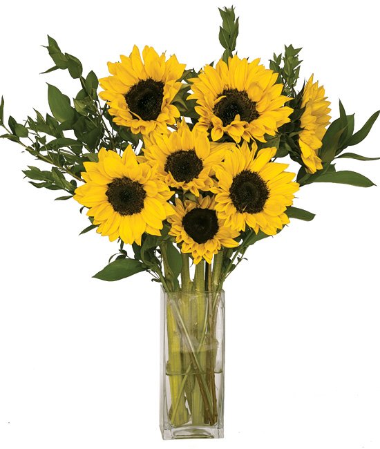 The quintessential flower of summertime, the sunflower is endowed with a talent for delivering a delightful dose of warmth and brightness to anyone in its presence. Each wide-eyed, sunflower is coaxed skyward by the persuasive powers of the California sun, then snipped before it bursts into its prime, shooting yellow rays as bright as noontime from a patch of midnight black. Sturdy stems arrange themselves to perfection in our wicker wrapped vase.