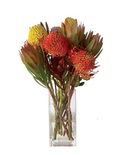 Sizzling shades of orange and yellow create one gorgeous display, a fact proven by this magnificent monochromatic bouquet alive with a variety of bold blooms. Combining a taste of the tropics, it features yellow and orange pincushions with sunset leucadendrons for an added punch of red and burgundy centers.