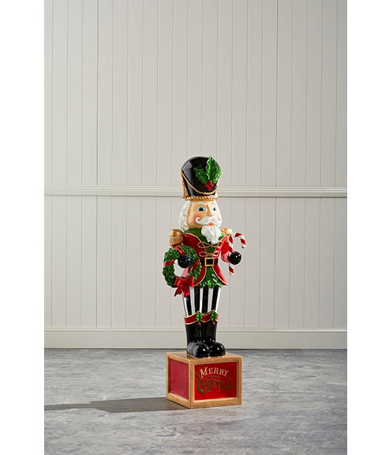 Our 1.24m Nutcracker is a lovely addition to elevate your display. Featuring a cheerful nutcracker standing tall, holding a wreath and candy cane on a “Merry Christmas” plinth, this piece has been meticulously crafted to capture the joy of the Christmas season. Its vibrant red, green, and gold hues, paired with a glossy white and black striped finish, make it the perfect centrepiece to warmly welcome your guests.