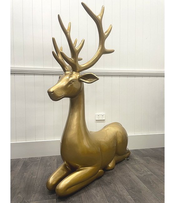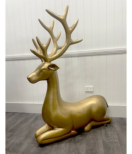 Bring a regal touch to your Christmas display with our 1.34m Sitting Gold Stag. Crafted from high-quality fibreglass, this stunning piece features a sleek, metallic gold finish that captures the light beautifully and adds a sense of festive elegance to any setting. With lifelike details and a graceful posture, this majestic stag creates a warm and luxurious atmosphere, perfect for both indoor and outdoor displays.