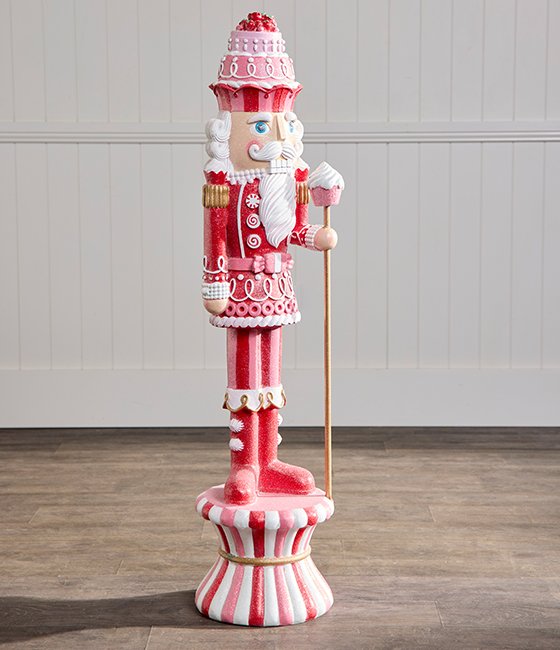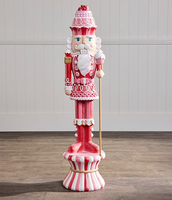 Standing at 1.2 metres tall, this Pink and White Candy Soldier brings a fun and festive twist to your Christmas display. Finished in glossy pink, white, and gold with fine candy-inspired detailing, this soldier stands proudly on a striped base and holds a festive staff. Crafted from durable resin, this delightful figure adds a playful yet elegant touch to any indoor Christmas display.