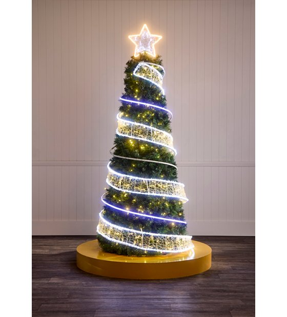 Illuminate your Christmas display with our dazzling 2.5m Light Up Animated Spiral Cone Tree. This showing-stopping piece features a striking spiral design wrapped in LED lights and complemented with a radiant LED Tree Top Star, making it the perfect focal point for any display. Thanks to its innovative Switching Technology, you can easily choose between Warm White or Bright White LED Lights on the transparent netting and rope light ribbon – tailor the ambience to suit your style.
