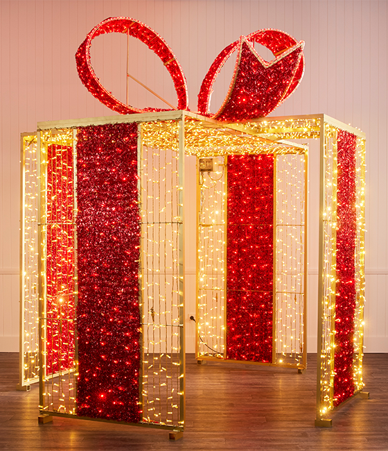 Illuminate your Christmas display with our 3m Gold and Red Light Up Gift Box Arch. This piece features a beautifully crafted gift box design wrapped in red tinsel carpet and adorned with vibrant, steady, and twinkling gold string lights, creating a warm and inviting glow. Perfect for both indoor and outdoor settings, this interactive piece creates a delightful attraction for guests and passersby, offering a wonderful photo opportunity.