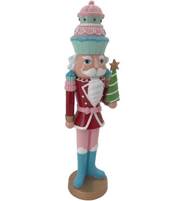 Our 45cm Pastel Christmas Solider is the perfect addition to elevate your display. This soldier is adorned in soft pink and blue hues, with a white glitter finish. The exquisite craftmanship features a skilfully layered cupcake hat and holds a vibrant green Christmas tree. Perfect as a table top centrepiece or on a mantel, this pastel soldier is not just a decoration but a delightful statement piece that embodies the joy and sweetness of the festive season.
