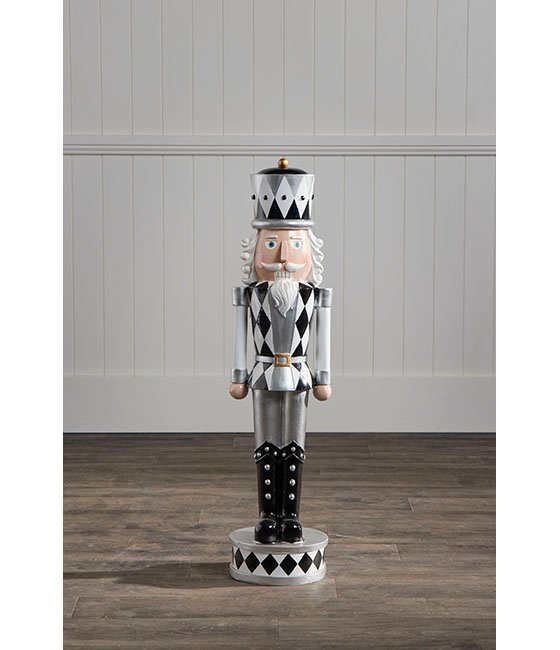 Our 90cm Silver and Black Nutcracker is the perfect addition to elevate your display. This exceptional craftsmanship features a glossy silver, black and white finish enriched with gold accents and a diamond pattern, bringing a timeless air of elegance and sophistication to any display.