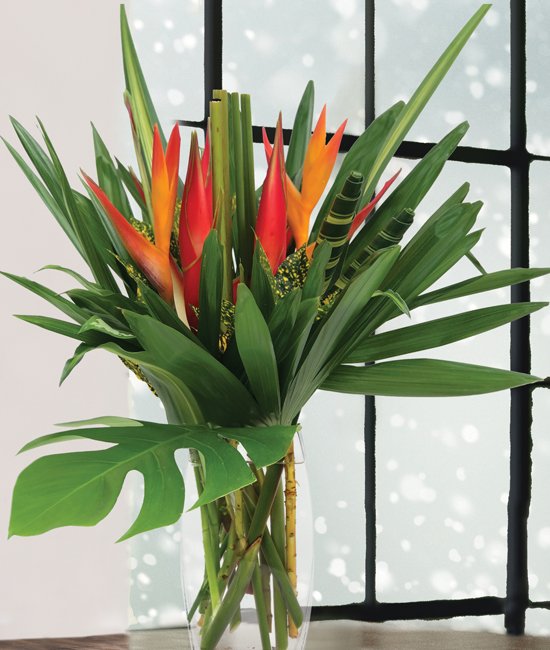 If your desire is to surprise someone with a virtual trip to the tropics, this dazzling, contemporary display does not disappoint. Rainforest riches gather in a tropical scene – can’t make it to the tropics bring them to you.