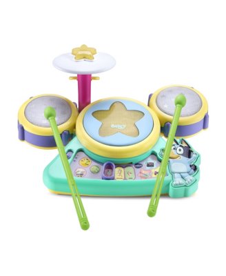 - Put on a show with Bluey and drum along to catchy electronic, country and pop melodies; see the drum pads and cymbal light up.